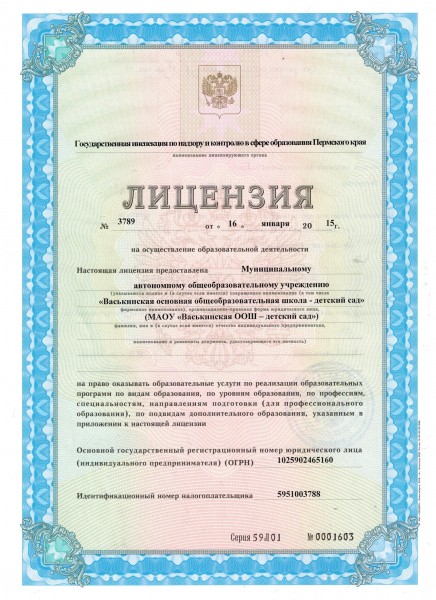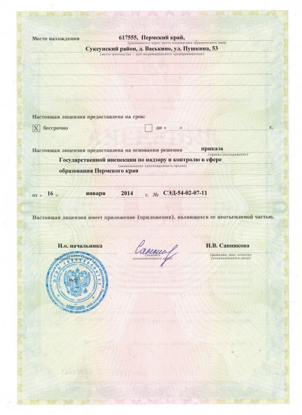• Места осуществления образовательной деятельности по дополнительным образовательным программам: 617555, Пермский край, Суксунский район, д.Васькино, ул.Пушкина, 53