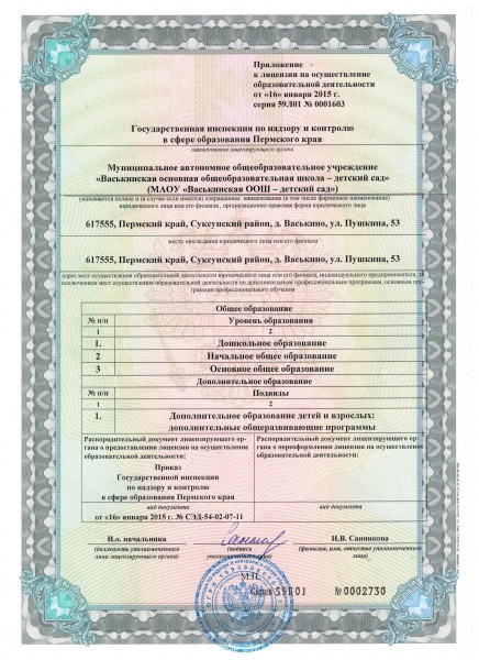 - Места осуществления образовательной деятельности по дополнительным образовательным программам: 617555, Пермский край, Суксунский район, д.Васькино, ул.Пушкина, 53